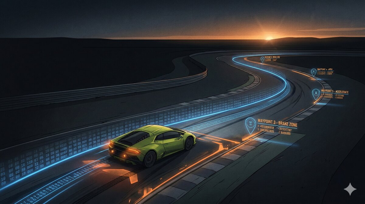 A dark atmospheric digital illustration of a supercar (Lime Lamborghini Huracan style silhouette) on a race circuit at dawn, seen from above at an angle. Overlaid translucent hex dump digits and binary data streams flow along the racing line like telemetry data. GPS waypoint markers dot the track. Color palette: deep charcoal (#101218), electric blue (#468CDC) data streams, warm orange brake zone accents. Technical illustration style, slightly stylized, 16:9 landscape, dark background suitable for text overlay.